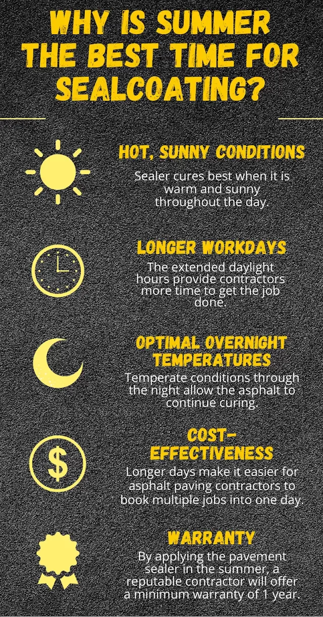 Check out this infographic for a brief overview of why warmer conditions are ideal for asphalt sealcoating, and how this time of year is perfect for your home or business to be proactive in maintaining your property.
